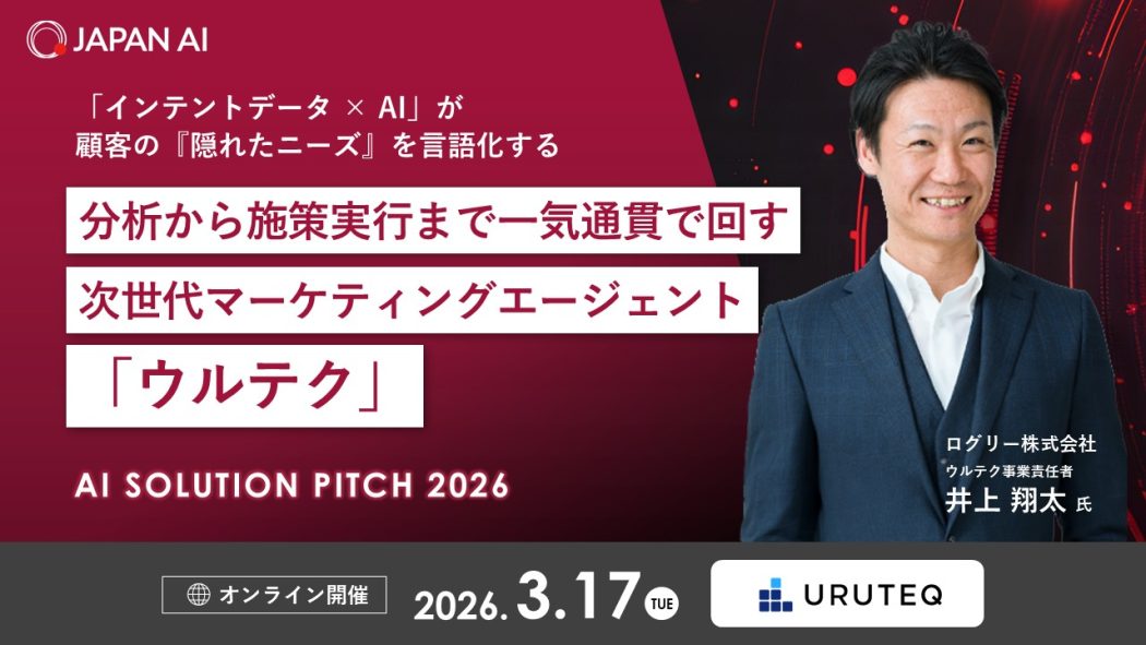 ログリー株式会社(本社:東京都渋谷区、代表取締役社長:吉永浩和、東証グロース:証券コード6579、以下、ログリー)は、2026年3月17日(火)より開催されるオンラインカンファレンス「AI SOLUTION PITCH 2026 ( https://japan-ai.co.jp/lp/conference/?organizationId=1762 )」(主催:JAPAN AI株式会社)に登壇することをお知らせいたします。